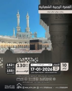 رحلة العمرة (الرجبية الشعبانية ) -تصادف مواليد أبطال كربلاء – المدة: ١٠ أيام • مكة: ٦ ليالي (فندق سويتس المقام) • المدينة المنورة: ليلتين (فندق أنوار المدينة موفنبيك) السعر: ١٣٠ دينار بحريني [ ١٣٠٠ريال سعودي] الرحلة تشمل: ▪️ الباصات الحديثة ▪️ السكن الراقي ▪️ الإرشاد الديني ▪️ الماي والشاي ٢٤ …