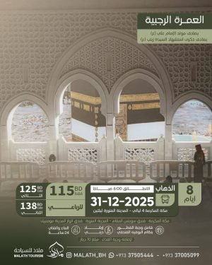 رحلة العمرة (الرجبية) * تصادف مولد الإمام علي ع * استشهاد السيدة زينب ع المدة: ٨ أيام • مكة: ٤ ليالي (فندق سويتس المقام) • المدينة المنورة: ليلتين (فندق أنوار المدينة موفنبيك) السعر: ١١٥ دينار بحريني [ ١١٥٠ ريال سعودي] الرحلة تشمل: ▪️ الباصات الحديثة ▪️ السكن الراقي ▪️ الإرشاد …
