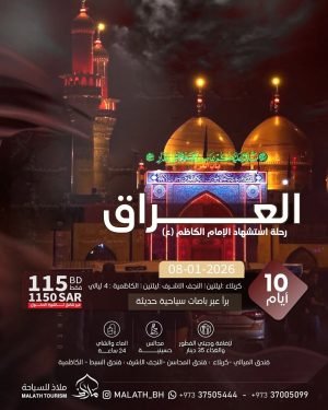 رحلة العراق (رحلة استشهاد الإمام الكاظم ع) المدة: ١٠ أيام السعر: ١١٥ دينار بحريني [١١٥٠ ريال سعودي] (السعر غير شامل التأشيرة) الرحلة تشمل: ▪️ الباصات الحديثة ▪️ السكن الراقي ▪️ مجالس حسينية ▪️ الماي والشاي ٢٤ ساعة ملاحظة: يمكن إضافة وجبتي الفطور و الغذاء بنظام البوفيه – مبلغ ٣٥دينار (٣٥٠ …