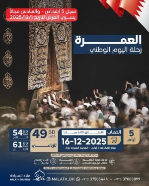 رحلة العمرة (إجازة العيد الوطني) المدة: ٥ أيام السعر: ٤٩ دينار بحريني [٤٩٠ ريال سعودي] الرحلة تشمل: ▪️ الباصات الحديثة ▪️ السكن الراقي ▪️ الإرشاد الديني ▪️ الماي والشاي ٢٤ ساعة ▪️وجبة الإفطار بوفيه فندقي ملاحظة: يمكن إضافة وجبة الغذاء بمبلغ ٥ دينار [٥٠ ريال] كونوا معنا … للتسجيل والاستفسار …