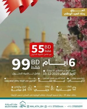 رحلة العراق (إجازة العيد الوطني) المدة: ٦ أيام السعر: ٥٥ دينار بحريني [٥٥٠ ريال سعودي] بدون تأشيرة الدخول ٩٩ دينار بحريني [٩٩٠ ريال سعودي] مع تأشيرة الدخول الرحلة تشمل: * المواصلات الحديثة * السكن الراقي * الإرشاد الديني * البرامج الدينية ملاحظة: يمكن إضافة الوجبات بنظام البوفيه – زيادة مبلغ …