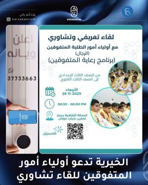 أولياء أمور الطلبة المتفوقين (الرجال فقط) لحضور اللقاء التعريفي التشاوري حول برنامج *رعاية المتفوقين* من الثالث إعدادي ولغاية الثالث ثانوي وذلك يوم الأربعاء / ليلة الخميس الساعة 6:30 مساءً بالصالة الثقافية لمركز تمكين شباب كرزكان يرجى التسجيل بمسح الرمز الموجود في صورة الإعلان مع تحيات/ لجنة دعم الطالب جمعية كرزكان …