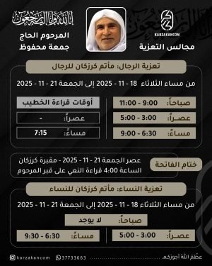 أوقات التعزية في الصورة المرفقة 🔺 *تعازي الرجال* 📍مأتم كرزكان للرجال 🔺 *تعازي النساء* 📍مأتم كرزكان للنساء ⚫ إنّا لله و إنّا إليه راجعون ⚫ الفاتحة المصدر: إنستغرام