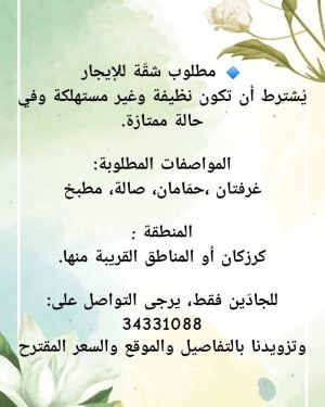 يُشترط أن تكون نظيفة وغير مستهلكة وفي حالة ممتازة. المواصفات المطلوبة: غرفتان حمّامان صالة مطبخ المنطقة : كرزكان أو المناطق القريبة منها. للجادّين فقط، يرجى التواصل على: 34331088 وتزويدنا بالتفاصيل والموقع والسعر المقترح. المصدر: إنستغرام