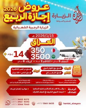 ✈️حملة الزيارة✈️ 🔴الزيارة الرجبية الشعبانية🔴 😍 العراق 😍 🚌 باص مباشر الى العراق تاريخ السفر 15/1/2026 المدة 14 يوم سعر الرحلة 350 دينار بحريني 🇧🇭 3500 ريال سعودي 🇸🇦 الرحلة تشمل : 🏬 الإقامة في فنادق راقية وقريبة الى الحرم في العراق 🇮🇶 النجف : فندق نبع الكوثر الدولي …