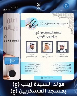 🔸 ذكرى مولد السيدةزينب عليها السلام 📅 ليلة الأربعاء 28 / 10 / 2025 ⏰ بعد صلاة العشاءين مباشرة فقرات الحفل ~ القرآن الكريم ~ الكلمة سماحة الشيخ أحمد الزاكي ~ الشعر الدكتور علي خميس ~ الجلوات الرادود محمد مدن 🔸يوجد مكان مخصص للنساء 🔸 للضيافة والاستفسار على الأرقام التالية …