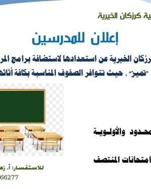 *”إعلان”* ✋🏻 عزيزي المعلم.. هل تحتاج لزيادة دخلك؟؟ ألديك مشروع تعليمي، وليس لديك مكان مناسب؟؟ 🏩 نحن نوفر لك المكان المجهز بكامل الأثاث والبيئة التعليمية المناسبة .. ❇️ تعلن جمعية كرزكان الخيرية عن استعدادها لاستضافة برامج المراجعة والتقوية وذلك في مقرها التعليمي *تميز* 🔄 *ملاحظات:* -عدد الصفوف محدود والأولوية للمسجلين …