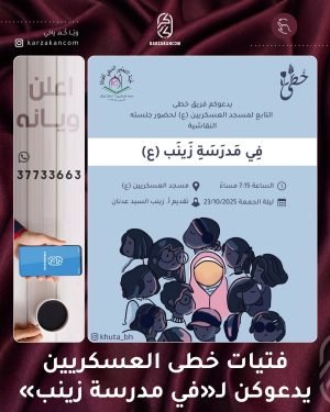 يعلن *فريق خطى* التابع لمسجد العسكريين فعاليته الرابعة عشر.. (*في مدرسة زينب*) 🪻 *اليوم:* يوم الخميس ، ليلة الجمعة 🪻 *التاريخ:* 23-10-2025 🪻 *الوقت:* 7:15 مساءً 🪻 *الفئة:* 15 فما فوق 🪻 *المكان:* مسجد العسكريين (ع) 🪻 *تقديم:* أ. زينب سيد عدنان 🪻 *للاستفسار:* 33790744 ♦️يمكن لذوي الأعذار الدخول للتسجيل …