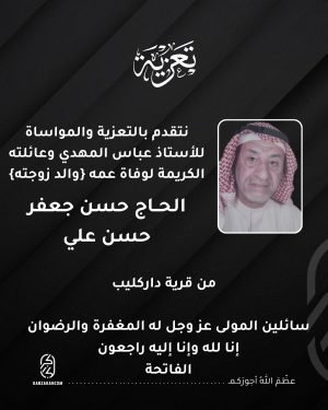 بوفاة عمه {والد زوجته} *الحاج حسن جعفر حسن علي* من قرية داركليب أمس الأربعاء 22-10-2025 تفاصيل أوقات ومجالس التعزية في الصورة المرفقة *أماكن مجالس التعزية*: *للرجال*: مأتم الجبور – داركيب *للنساء*: صالة فدك بمأتم الجبور – داركليب ختام الفاتحة يوم السبت 25-10-2025 تغمد الله الفقيد بواسع رحمته وألهم أهله وذويه …