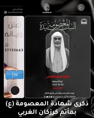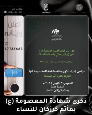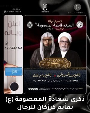 ❞ ذكــرىٰ رحيل السيّدة ،، ❞ فاطمة المعصومة ’ع‘ ،، ▓ ليلة الجمعة 2-10-2025 ▓ الخطابة الحسينية █ الشيخ عبدالمحسن الجمري ≣ مأتم كرزكان للرجال ⌯ 07:00 مساءً ┈╾⊶﹝₍⁽( اﻟسَّـﻟامُـ ﻋَﻟَﯾْﮑِ ﯾَا ﻓَاطِمَـةَ اﻟمَـﻋْصُۆمَھ )⁾₎﹞⊷╼┈ ▓ صباح الجمعة 3-10-2025 ▓ الخطابة الحسينية █ الشيخ جاسم الحداد ≣ مأتم كرزكان للرجال …