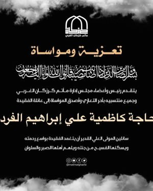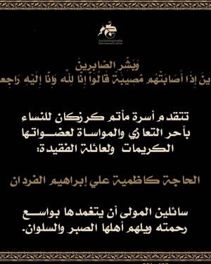 – . . بسم ٱلله الرَّحْمٰنِ الرَّحِيـمِ {كُلُّ نَفْسٍ ذَآئِقَةُ الْمَوْتِ وَإِنَّمَا تُوَفَّوْنَ أُجُورَكُمْ يَوْمَ الْقِيَامَةِ فَمَن زُحْزِحَ عَنِ النَّارِ وَأُدْخِلَ الْجَنَّةَ فَقَدْ فَازَ وَما الْحَيَاةُ الدُّنْيَا إِلاَّ مَتَاعُ الْغُرُورِ } صدق الله العلي العظيم . . تتقدم إدارة مأتم كرزكان للرجال بخالص العزاء والمواساة لعائلة المرحومة . . “الحاجة كاظمية علي إبراهيم …