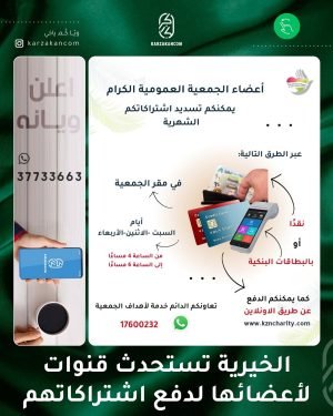 تعلن الجمعية عن استقبال الأعضاء الراغبين في تسديد اشتراكاتهم سواءً نقداً أو عن طريق البطاقات البنكية، وذلك في مقر الجمعية خلال الأيام: 🔹 السبت 🔹 الاثنين 🔹 الأربعاء ⏰ من الساعة 4:00 مساءًا إلى 6:00 مساءًا. كما يمكنكم الدفع المباشر ( اونلاين) عبر : www.kzncharity.com نرحب بكم وبتعاونكم الدائم لخدمة …