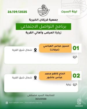 26-09-2025 لكل من: 1️⃣ حسين عباس العباسي (عرفات) العنوان :شمال شرق القرية 2️⃣ الحاج كاظم محمد عباس عاشور العنوان: شمال شرق القرية *اللهم إشف كل مريض* ♦️ *وقت الزيارة من الساعة* 6:30 – 8:30 ♦️لمتابعة أخبار *جمعية كرزكان الخيرية* 🔺Instagram: @karzakancharity 🔺 Facebook: جمعية كرزكان الخيرية صفحة الدفع الألكتروني …