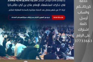 matamkarzakan ’ ☾ ﻣأﭠم ﻛرزﻛٱن ﻟﻟرﺟٱل ⌯ استشهاد أمير المؤمنين الإمام علي ‘ع’⌯ ◁يدعوكم مأتم كرزكان للرجـال للـتــبرك بحضور مـأدبة الإفـطـار في ذكرى استشهـاد الإمـام عـلـي عليه السلام.. 🗓️ليلة 21 من شهر رمضان. ⏰ بعد الصلاة مباشرة بالساحة المقابلة للمأتم. *ملاحظة:* -نرجو من المعزين الكرام عدم إيقاف سيارتهم في الساحة. …