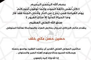 – . . بسم ٱلله الرَّحْمٰنِ الرَّحِيـمِ {كُلُّ نَفْسٍ ذَآئِقَةُ الْمَوْتِ وَإِنَّمَا تُوَفَّوْنَ أُجُورَكُمْ يَوْمَ الْقِيَامَةِ فَمَن زُحْزِحَ عَنِ النَّارِ وَأُدْخِلَ الْجَنَّةَ فَقَدْ فَازَ وَما الْحَيَاةُ الدُّنْيَا إِلاَّ مَتَاعُ الْغُرُورِ } صدق الله العلي العظيم . . تتقدم إدارة مأتم كرزكان للرجال بخالص العزاء والمواساة لعائلة المرحوم . . “حسين حسن مكي خلف” …