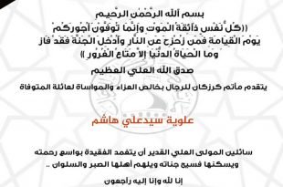 – . . بسم ٱلله الرَّحْمٰنِ الرَّحِيـمِ {كُلُّ نَفْسٍ ذَآئِقَةُ الْمَوْتِ وَإِنَّمَا تُوَفَّوْنَ أُجُورَكُمْ يَوْمَ الْقِيَامَةِ فَمَن زُحْزِحَ عَنِ النَّارِ وَأُدْخِلَ الْجَنَّةَ فَقَدْ فَازَ وَما الْحَيَاةُ الدُّنْيَا إِلاَّ مَتَاعُ الْغُرُورِ } صدق الله العلي العظيم . . تتقدم إدارة مأتم كرزكان للرجال بخالص العزاء والمواساة لعائلة المرحومة . . “علوية سيدعلي هاشم” . …