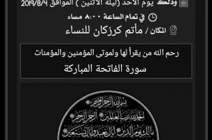 تأبين المرحومة زهرة عباس إبراهيم ليلة الاثنين القادمة بمأتم كرزكان للنساء …