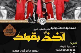 – . . . ۩ ﻣأﭠم ﻛرزﻛٱن … . . . الفعالية العاشورائية لطلاب التعليم الديني (آخذٌ بقولك) . . . ♦ الفقرات : ▪ مسرحية (الراية) ▪ عرافة طلابية مميزة ▪ كلمة ▪ شعر ▪ تلبيات . . المكان / مأتم شباب كرزكان الزمان / يوم السبت 15.9.2018 بعد …