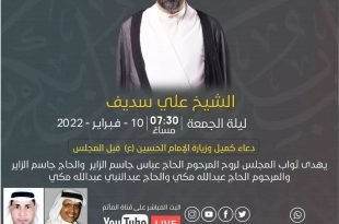 أكمل القراءة »المجلس الحسيني الاسبوعي ليلة الجمعة 10/2/2022 الشيخ علي سديف الساعة 7:30 مس…