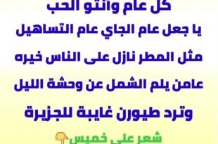 كل عام وانتو الحب كل عام وانتو الحب جيلن بعد جيل كل عام نتواصل على طيب سيرة نرمي من الأحمال ونخفف الشَّيل ونكتب على الأيام قصة مسيرة كل عام يقبل والمقادير تفصيل يا عثرة اللي لابسن ثوب غيره يغمس لسانه في مقالات تضليل ويشكي الزمن واهل الزمن والعشيرة كم حافرن …