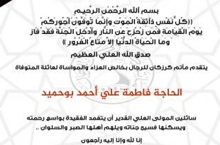 – . . بسم ٱلله الرَّحْمٰنِ الرَّحِيـمِ {كُلُّ نَفْسٍ ذَآئِقَةُ الْمَوْتِ وَإِنَّمَا تُوَفَّوْنَ أُجُورَكُمْ يَوْمَ الْقِيَامَةِ فَمَن زُحْزِحَ عَنِ النَّارِ وَأُدْخِلَ الْجَنَّةَ فَقَدْ فَازَ وَما الْحَيَاةُ الدُّنْيَا إِلاَّ مَتَاعُ الْغُرُورِ } صدق الله العلي العظيم . . تتقدم إدارة مأتم كرزكان للرجال بخالص العزاء والمواساة لعائلة المرحومة . . “الحاجة فاطمة علي أحمد …