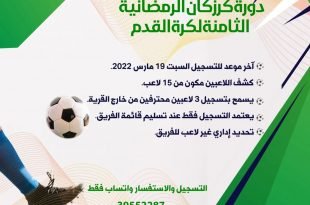 اللجنة الرياضية بالمركز تعلن عن بدء التسجيل لدورة كرزكان الرمضانية الثامنة لكرة القدم. ◽آخر موعد للتسجيل السبت ١٩ مارس ٢٠٢٢. ◽كشف اللاعبين مكون من ١٥ لاعب. ◽يسمح بتسجيل ٣ لاعبين محترفين من خارج القرية. ◽يعتمد التسجيل فقط عند تسليم قائمة الفريق. ◽تحديد إداري غير لاعب للفريق. ◽التسجيل والاستفسار واتساب فقط …