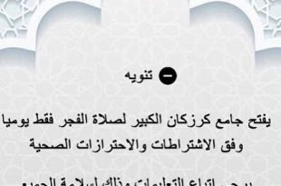تنويه . . ۩ جۚامۘـ؏ كرزكان. . . . يفتح جامع كرزكان الكبير لصلاة الفجر فقط يوميا وفق الاشتراطات والاحترازات الصحية . . 🔴 ملاحظة هامه : . . يرجى اتباع التعليمات التالية : . 1-اصطحاب السجادة والتربة الخاصه بك . 2- يلزم ارتداء الكمام من دخول المسجد الى حين …