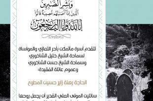 . ◾تتقدم أسرة كرزكانـ.ـكم بخالص العزاء والمواساة لعائلة الفقيدة المرحومة الحاجة رهنة زاير حسين المطوع وإلى سماحة الشيخ خليل وسماحة الشيخ حسن الشاخوري رحم الله الفقيدة واسكنها فسيح جناته مع محمد وآل محمد الطيبين الطاهرين وألهم أهلها الصبر والسلوان وإنا لله وإنا إليه راجعون الرجاء كتابة التعزية على هذا البوست …