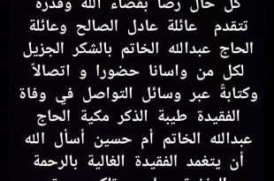 بسم الله الرحمن الرحيم الحمد لله رب العالمين الحمد لله على كل حال رضاً بقضاء الله وقدره تتقدم عائلة عادل الصالح وعائلة الحاج عبدالله الخاتم بالشكر الجزيل لكل من واسانا حضورا و اتصالاً وكتابةً عبر وسائل التواصل في وفاة الفقيدة طيبة الذكر مكية الحاج عبدالله الخاتم أم حسين أسأل الله …