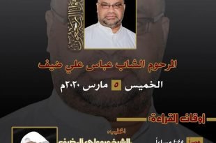 . ◼مجالس التعزية للمرحوم الشاب عباس علي محمد ضيف من عصر اليوم الجمعة 06-03-2020 . ▪الرجال: مأتم الحاج أحمد ضيف القراءة عصرا 4:45 القراءة ليلا 7:15 الخطيب: الشيخ عبدعلي آل ضيف . ▪النساء : مأتم كرزكان للنساء الفاتحة، . . 🔻للإخبار عن حالة وفاة: – وتس أب 37733663 – فوزي …