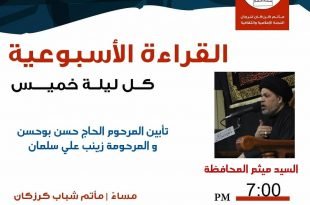 – . . . ۩ مأتم كرزكان … . . « القرآءة الأسبوعية» . . *الخطيب* : السيد ميثم المحافظة *الوقـــت* : 7:00 م . *المكـــان* : مأتم شباب كرزكان *اللــــيلة* : ليلة الخميس *الموافق* : 28/11/2018 . . 🔹️تأبين المرحوم الحاج حسن بوحسن و المرحومة زينب علي سلمان (أم …