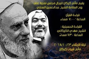 – . . . ۩ ﻣأﭠم ﻛرزﻛٱن .. . . . يقيم مأتم كرزكان للرجال مجلس تعزية على روح العلامة الشيخ عبدالحسين الستري . . 🔸️قراءة القرآن الساعة 7:00 مساء . . 🔸️القراءة الحسينية { الشيخ مهدي الكرزكاني } الساعة 7:30 مساء . . ليلة الاربعاء 23/10/2018 مأتم شباب كرزكان …