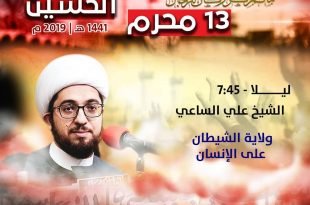 – . . ۩ ﻣأﭠم ﻛرزﻛٱن .. . . ♦ عاشوراء الحسين – ١٤٤١ هـ | 2019 م . . {13 محرم} . . 🔸️ليلاً – 7:45 (الشيخ علي الساعي) . . [ولاية الشيطان على الانسان] . . ⚠️ ملاحظة : – يوجد بث مباشر للنساء بمأتم كرزكان للنساء. . …