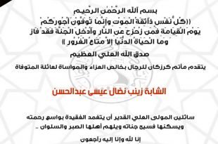 – . . بسم ٱلله الرَّحْمٰنِ الرَّحِيـمِ {كُلُّ نَفْسٍ ذَآئِقَةُ الْمَوْتِ وَإِنَّمَا تُوَفَّوْنَ أُجُورَكُمْ يَوْمَ الْقِيَامَةِ فَمَن زُحْزِحَ عَنِ النَّارِ وَأُدْخِلَ الْجَنَّةَ فَقَدْ فَازَ وَما الْحَيَاةُ الدُّنْيَا إِلاَّ مَتَاعُ الْغُرُورِ } صدق الله العلي العظيم . . تتقدم إدارة مأتم كرزكان للرجال بخالص العزاء والمواساة لعائلة المرحومة . . “الشابة زينب نضال عيسى …