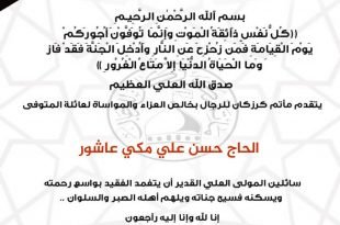 – . . بسم ٱلله الرَّحْمٰنِ الرَّحِيـمِ {كُلُّ نَفْسٍ ذَآئِقَةُ الْمَوْتِ وَإِنَّمَا تُوَفَّوْنَ أُجُورَكُمْ يَوْمَ الْقِيَامَةِ فَمَن زُحْزِحَ عَنِ النَّارِ وَأُدْخِلَ الْجَنَّةَ فَقَدْ فَازَ وَما الْحَيَاةُ الدُّنْيَا إِلاَّ مَتَاعُ الْغُرُورِ } صدق الله العلي العظيم . . تتقدم إدارة مأتم كرزكان للرجال بخالص العزاء والمواساة لعائلة المرحوم . . “الحاجة حسن علي مكي …