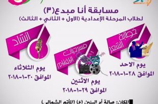 *#تذكير* مسابقة *أنا مبـ(3)ـدع* 🎥📽✍🏻🗣🧠🎭 *لطلاب المرحلة الإعدادية (الاول + الثاني + الثالث)* *تبدأ المنافسات* *من يوم الاحد القادم الموافق 28-1-2018* *ولمدة 3 ايام متتالية* *يوم الأحد* *[منافسات الخطابة و الشعر]* *يوم الاثنين* *[منافسات المسرح و الأفلام]* *يوم الثلاثاء* *[منافسات الإنشاد]* 🕌 المكان: *صالة أم البنين (ع) (المأتم الشمالي)* ⏱ …