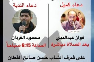 أكمل القراءة ». إعلان دعاء كميل ودعاء الندبة بجامع كرزكان الكبير لهذا الإسبوع 28 ديسمبر 2017 م…