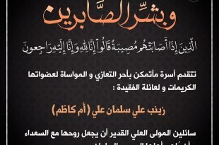 تتقدم إدارة مأتم كرزكان الغربي وجميع منتسبيه بخالص العزاء والمواساة لعائلة الفقيدة المتوفاة الحاجة زينب علي سلمان سائلين المولى القدير ان يتغمد الفقيدة بواسع رحمته وان يسكنها فسيح جنته .. إنا لله وإنا إليه لراجعون . . #Bahrain #Karzakan #Matmalgharbi #مأتم_كرزكان_الغربي #كرزكان #البحرين المصدر