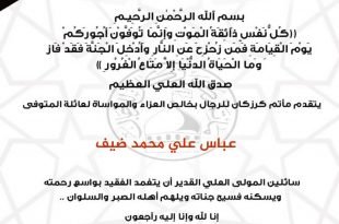 – . . بسم ٱلله الرَّحْمٰنِ الرَّحِيـمِ {كُلُّ نَفْسٍ ذَآئِقَةُ الْمَوْتِ وَإِنَّمَا تُوَفَّوْنَ أُجُورَكُمْ يَوْمَ الْقِيَامَةِ فَمَن زُحْزِحَ عَنِ النَّارِ وَأُدْخِلَ الْجَنَّةَ فَقَدْ فَازَ وَما الْحَيَاةُ الدُّنْيَا إِلاَّ مَتَاعُ الْغُرُورِ } صدق الله العلي العظيم . . تتقدم إدارة مأتم كرزكان للرجال بخالص العزاء والمواساة لعائلة المرحوم . . “عباس علي محمد ضيف” …