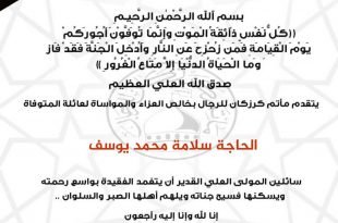 – . . بسم ٱلله الرَّحْمٰنِ الرَّحِيـمِ {كُلُّ نَفْسٍ ذَآئِقَةُ الْمَوْتِ وَإِنَّمَا تُوَفَّوْنَ أُجُورَكُمْ يَوْمَ الْقِيَامَةِ فَمَن زُحْزِحَ عَنِ النَّارِ وَأُدْخِلَ الْجَنَّةَ فَقَدْ فَازَ وَما الْحَيَاةُ الدُّنْيَا إِلاَّ مَتَاعُ الْغُرُورِ } صدق الله العلي العظيم . . تتقدم إدارة مأتم كرزكان للرجال بخالص العزاء والمواساة لعائلة المرحومة . . “الحاجة سلامة محمد يوسف” …