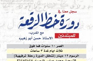 تقيم اللجنة الثقافية في مأتم كرزكان الغربي دورة خط الرقعة للمبتدئين مع المدرب الأستاذ حسن ابوزهيره. فعلى الراغبين في التسجيل التواصل مع الرقم الموجود بالاعلان .. المقاعد محدودة . 🕌 المكان: ملحق مأتم كرزكان الغربي 🕓 المدة: ثلاث أيام لمدة ثلاث ساعات 💰 الرسوم: ١٢ دينار ♦️ تبدأ الدورة في …