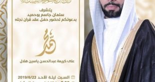 أكمل القراءة »يتشرف سلمان جاسم بوحميد بدعوتكم لحضور حفل عقد قران نجله محمد السبت ليلة الأحد 22…