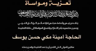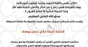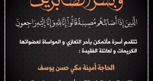 – . . بسم ٱلله الرَّحْمٰنِ الرَّحِيـمِ {كُلُّ نَفْسٍ ذَآئِقَةُ الْمَوْتِ وَإِنَّمَا تُوَفَّوْنَ أُجُورَكُمْ يَوْمَ الْقِيَامَةِ فَمَن زُحْزِحَ عَنِ النَّارِ وَأُدْخِلَ الْجَنَّةَ فَقَدْ فَازَ وَما الْحَيَاةُ الدُّنْيَا إِلاَّ مَتَاعُ الْغُرُورِ } صدق الله العلي العظيم . . تتقدم إدارة مأتم كرزكان للرجال بخالص العزاء والمواساة لعائلة المرحومة . . “الحاجة أمينة مكي حسن …