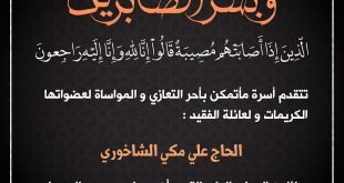 . تتشرف عائلة المرحوم الحاج علي البناي بدعوتكم لحضور حفل عقد قرآن نجلهم «أسامة»،…